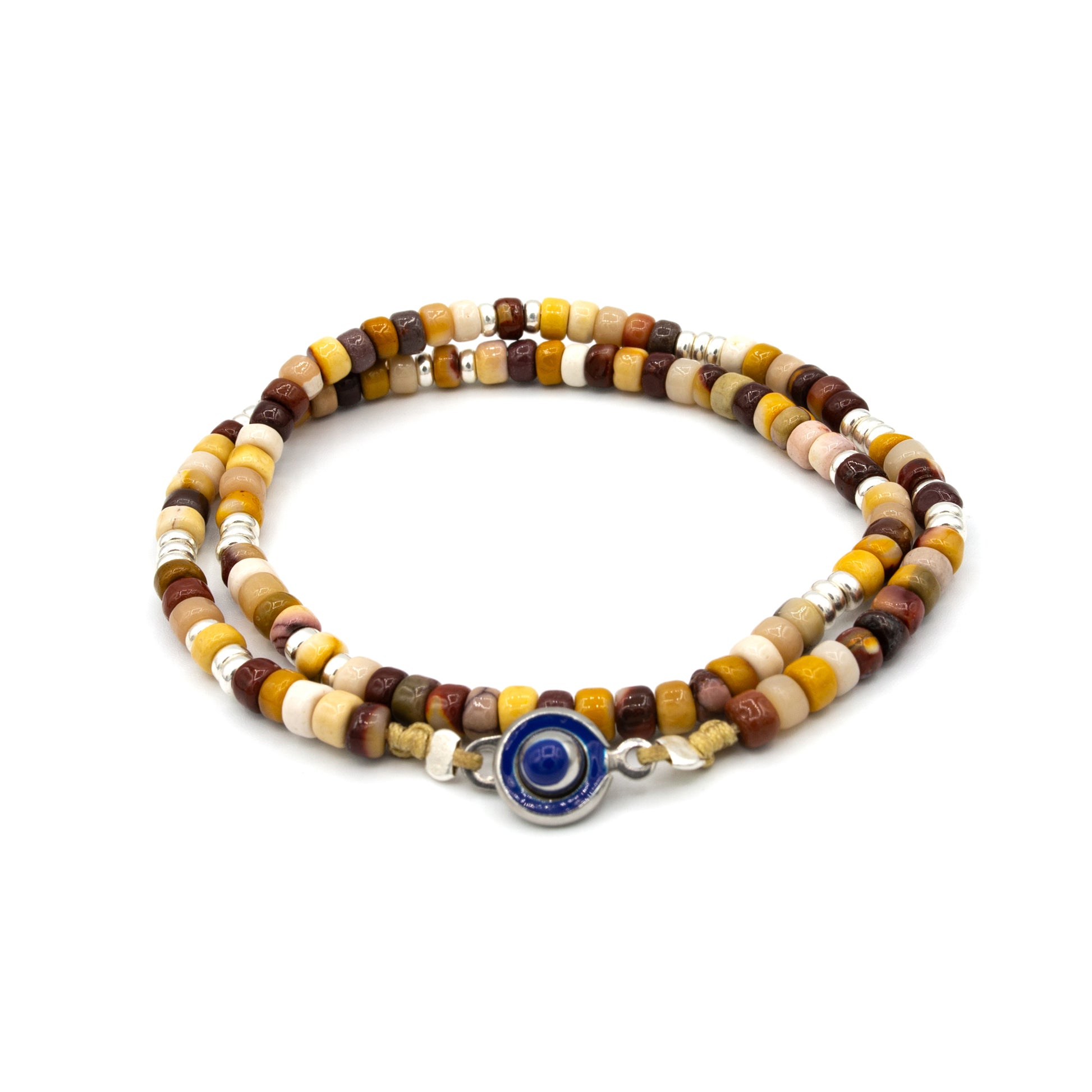 Warm and earthy, the Praline Silver Double-Wrap Bracelet features natural mookaite jasper beads paired with sterling silver. Its rich blend of burgundy, mustard, and cream tones adds depth and character to any look.
